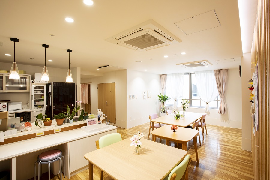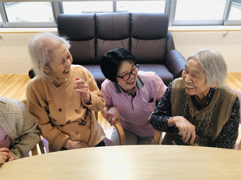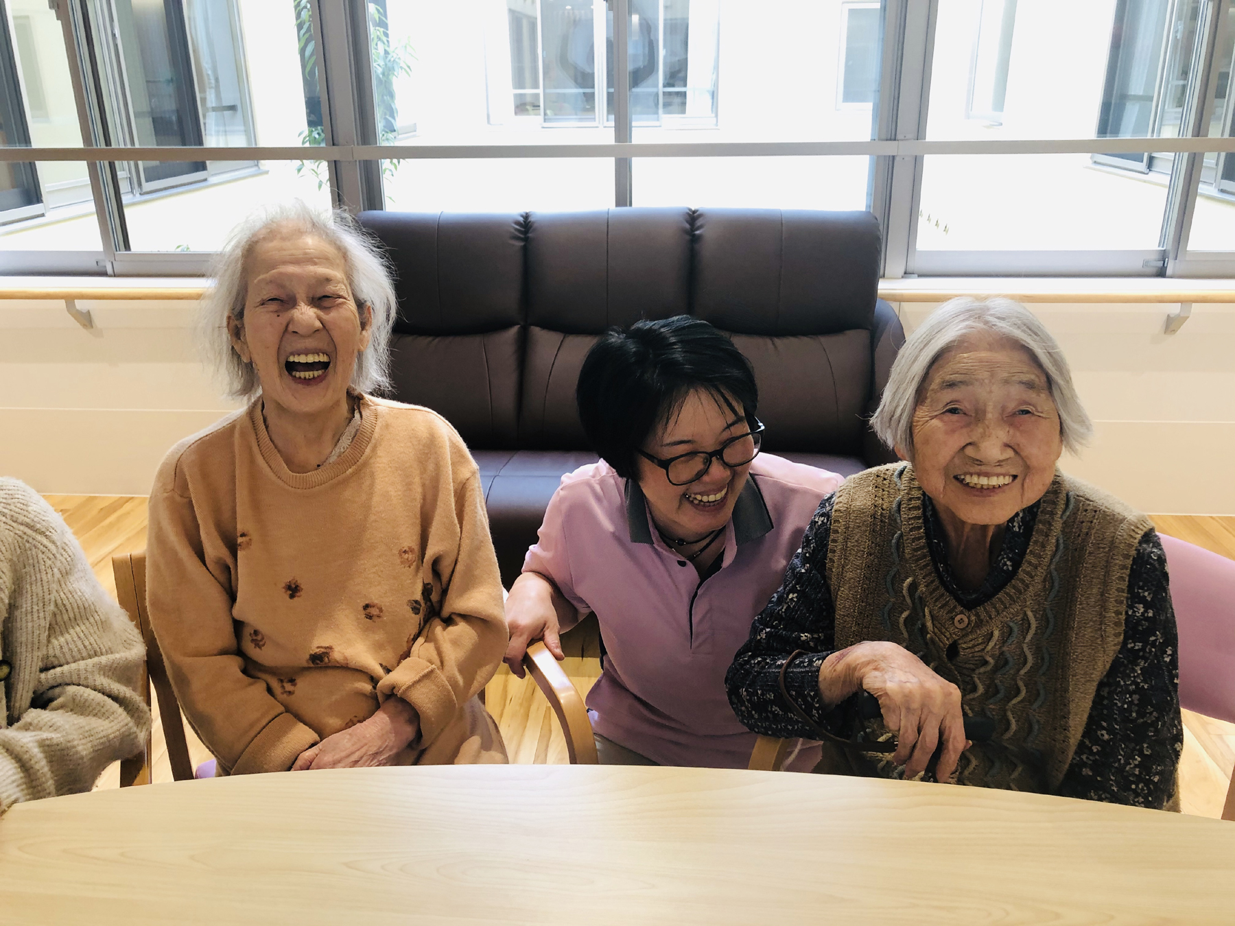 入居者皆様のコミュニケーションの場としてソファを置いています。ご利用者様の笑顔のいこの場として、スタッフも一緒におしゃべりしています。