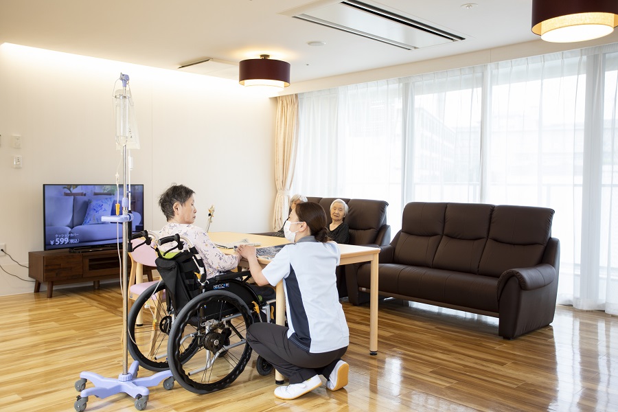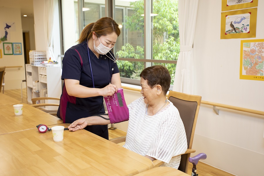 看護師資格を持つスタッフが常駐して、ご利用者様の健康をしっかり管理。体温・血圧・脈拍などの測定など、一日の状態観察を行います。